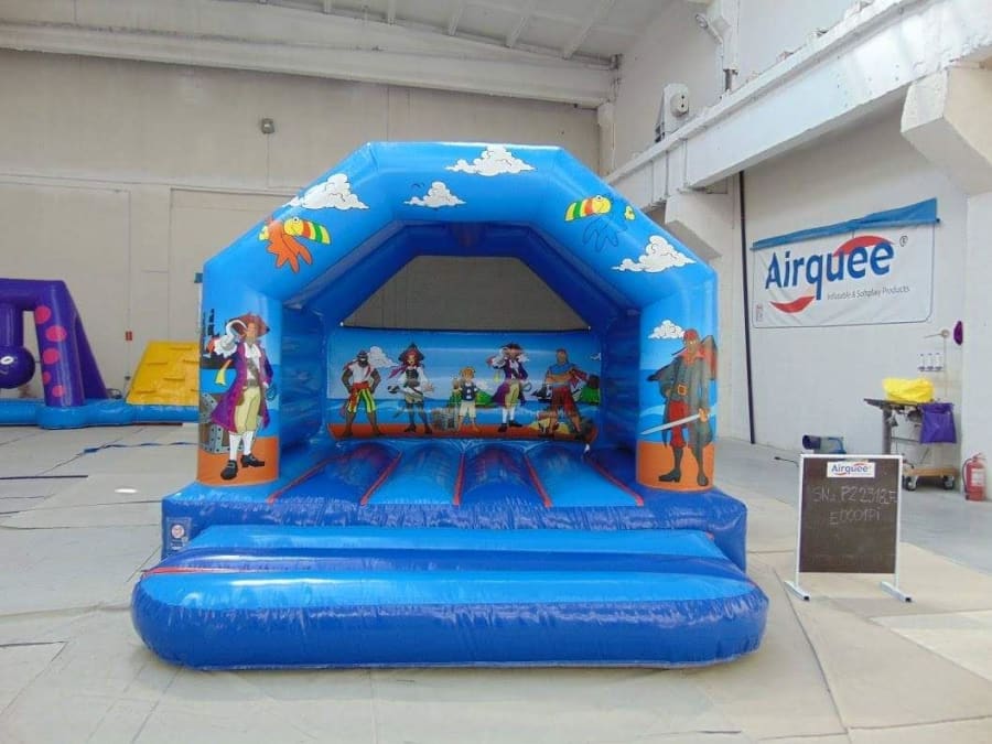 This pirate bouncy castle is ideal for a boys or themed party, It has pirates on the front arch, with a pirate boat and pirates on the back wall. It can be used indoors and outdoors, has fantastic looking artwork and is great for small gardens or halls. The castle comes with a built in raincoat which gives protection from showers and the sun.