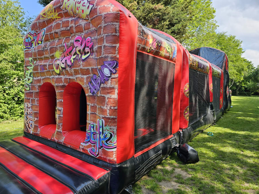 New to us in 2020 we have 2 assault course lengths to choose from either 45ft or 65ft. Suitable for children and adults, complate with bish bash and slides will be great fun for all ages. In an amazing graffiti them it is the best looking assault course out there